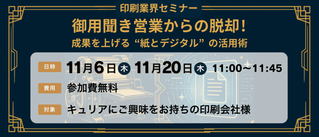 本セミナーでは、御用聞き営業というスタイルに慣れている印刷業界においてあくまで「印刷物の売上」を上げるということを目的に、営業現場でどのようにデジタルを活用していくのか、具体的な事例も交えてご紹介します。